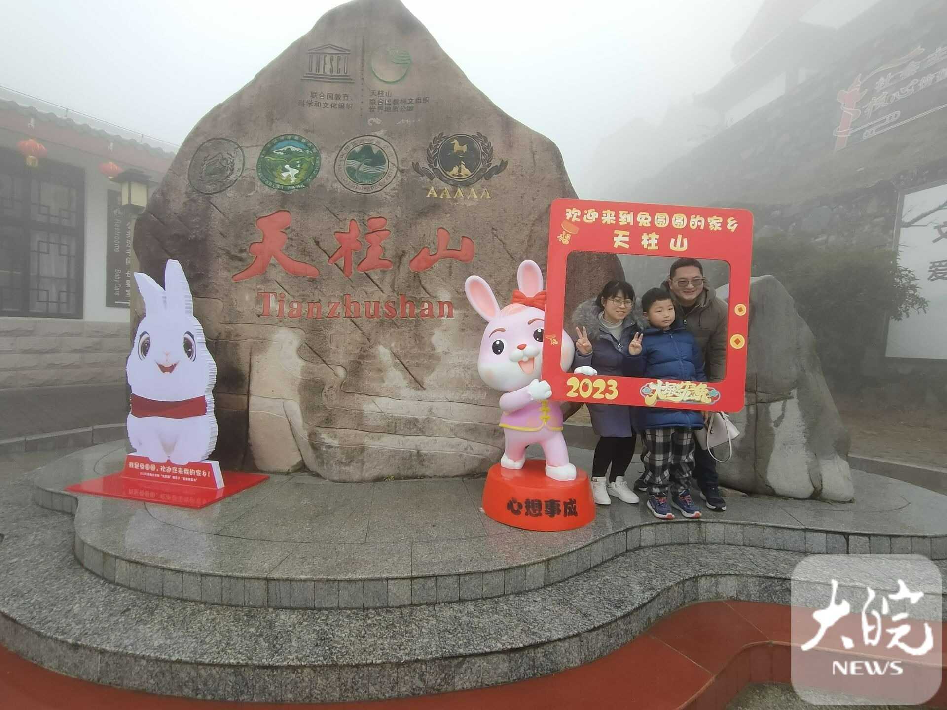 春節(jié)假期,天柱山風景美,年味濃,景區(qū)在馬祖、茶莊游客中心、天池峰等多處設有歡慶新年的“兔圓圓”卡通形象,游客在這里拍照,許下美好愿望。“今年春節(jié)帶著家人在天柱山旅游過年,提前在網(wǎng)上預訂好民宿,一家人開心快樂地體驗山岳風情,吃農(nóng)家菜、看民俗、滑冰雪、賞美景,體驗“慢生活”,在“兔圓圓”故鄉(xiāng)過兔年,意義非凡?!眮碜陨虾5挠嘞壬_心地說。